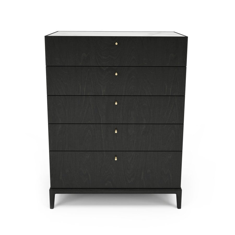 Raised legs, exposed frames, and minimalist bodies that exude modern elegance and sophistication. This 2 drawer nightstand is equipped with soft close glides and clad with natural brass handles and and cream lacquered glass top.
