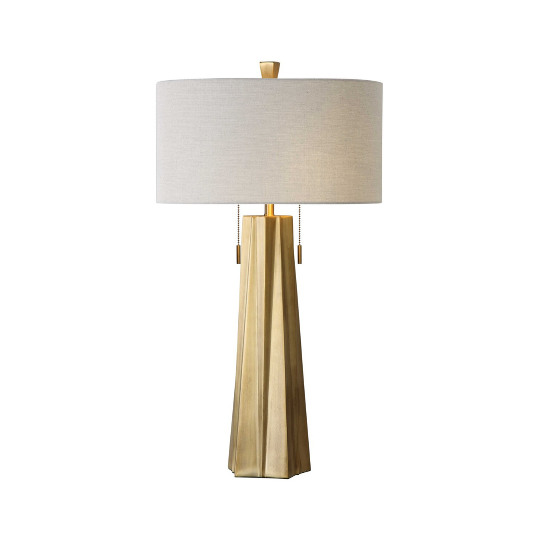 Shaped steel, moulded into an inverted star pattern, finished in a plated antiqued brass. The round hardback drum shade is a light beige linen fabric. This elegant design combines classic and contemporary elements, casting a warm, inviting glow. The sophisticated finish and refined details make it a striking focal point that complements a variety of décor styles.