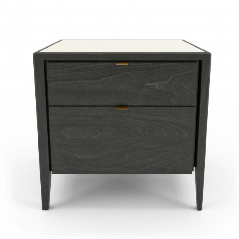 The Winston nightstand is made of solid birch and selected birch veneer, with a cream lacquered acid etched glass top.
